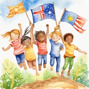 La actividad Carrera de relevos de equilibrio cultural fomenta la empatía, el trabajo en equipo y la comprensión cultural en los niños. Prepara el recorrido con banderas, conos, visuales de ecosistema…